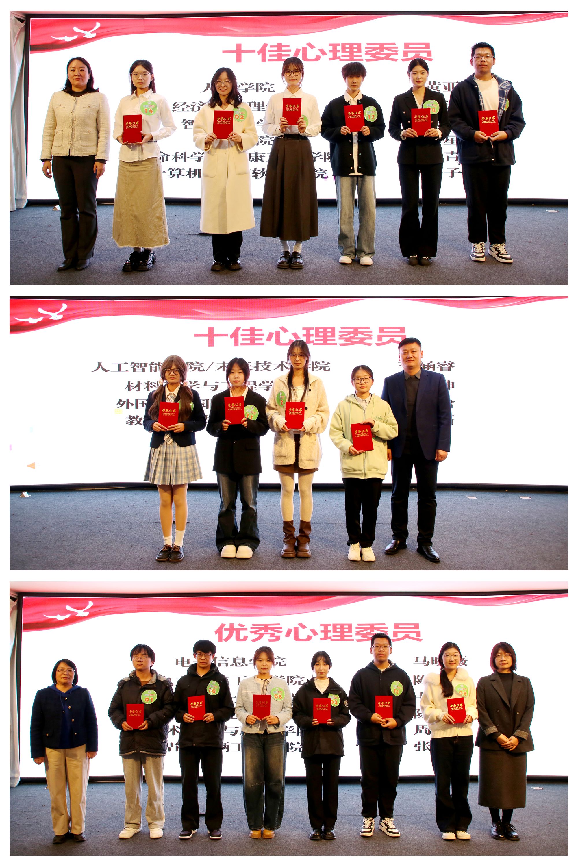 本届心理委员风采大赛分初赛和决赛两个环节。经过二级学院初赛,16名心理委员进入决赛环节。决赛现场设置“自我介绍与工作展示”“心理主题知识宣讲”“情景模拟”三个模块,全面考察选手的专业素养、应变能力与实践技巧。比赛过程紧张激烈、精彩纷呈,16位选手的精彩表现赢得现场阵阵掌声。经过激烈角逐,人文学院黄亚涵、经济与管理学院李诗雨、智能制造学院张家硕、会计学院马星如、生命科学与健康工程学院赵青怡、计算机学院/软件学院杨子烨、人工智能学院/未来技术学院李涵睿、材料科学与工程学院翟钰坤、外国语与国际传播学院刘瑞晗、教育科学与音乐学院吕佳芮获得洛阳理工学院2025年“十佳心理委员”荣誉称号;电子信息学院马晓薇、电力电气工程学院陈思蕊、智能建造与土木工程学院韦雨辰、能源与化工学院陈一涵、艺术设计与服装学院周紫怡、智能车辆工程学院张靖瑶获得“优秀心理委员”荣誉称号。