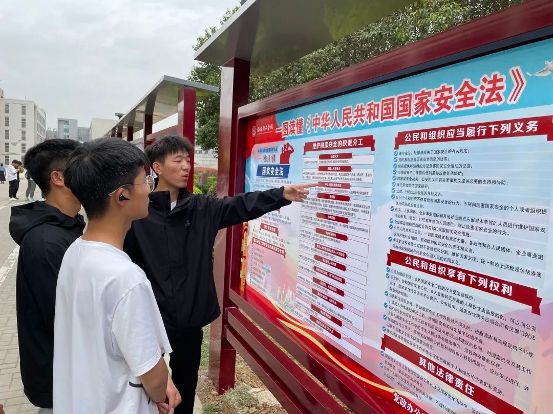 校园内开展立体宣传,公告栏内张贴着国家安全教育宣传海报、志愿者们也为路过的同学们发放宣传材料,该举措不仅营造了良好的国家安全宣传氛围,更增强了学生们对国家安全知识的了解。